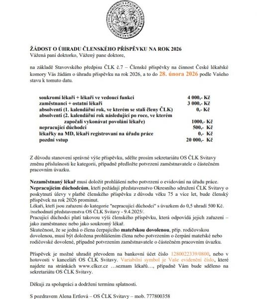 komory Vás žádám o úhradu přispěvku na rok 2026, a to do 28. února 2026 podle Vašcho